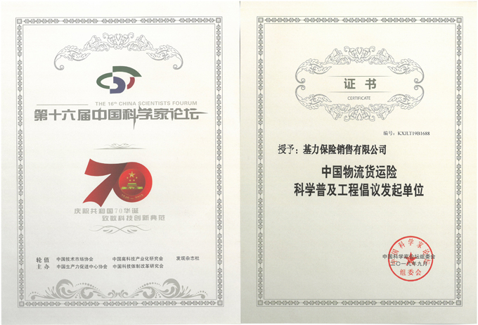 中国物流货运险科学普及工程倡议发起单位-证书